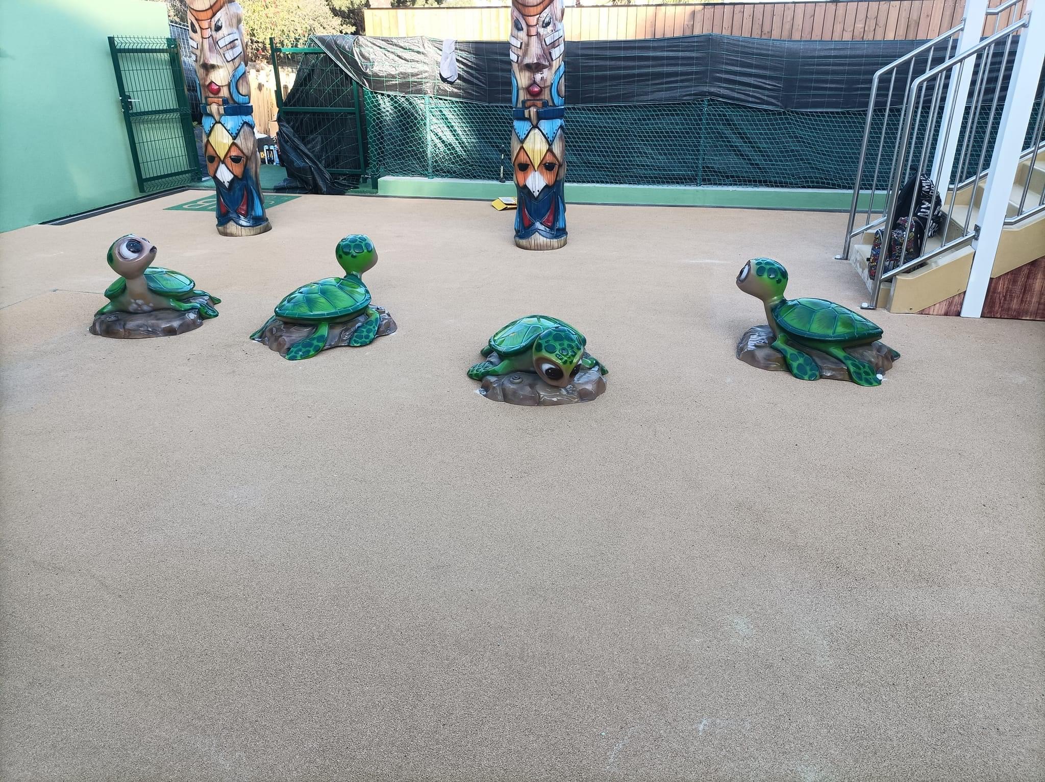 La zona húmeda fue complementada con piso amortiguante especializado, diseñado para reducir riesgos de resbalón y absorber impacto en áreas de tránsito y juego. Este sistema contribuye al cumplimiento de estándares internacionales de seguridad para espacios infantiles.
